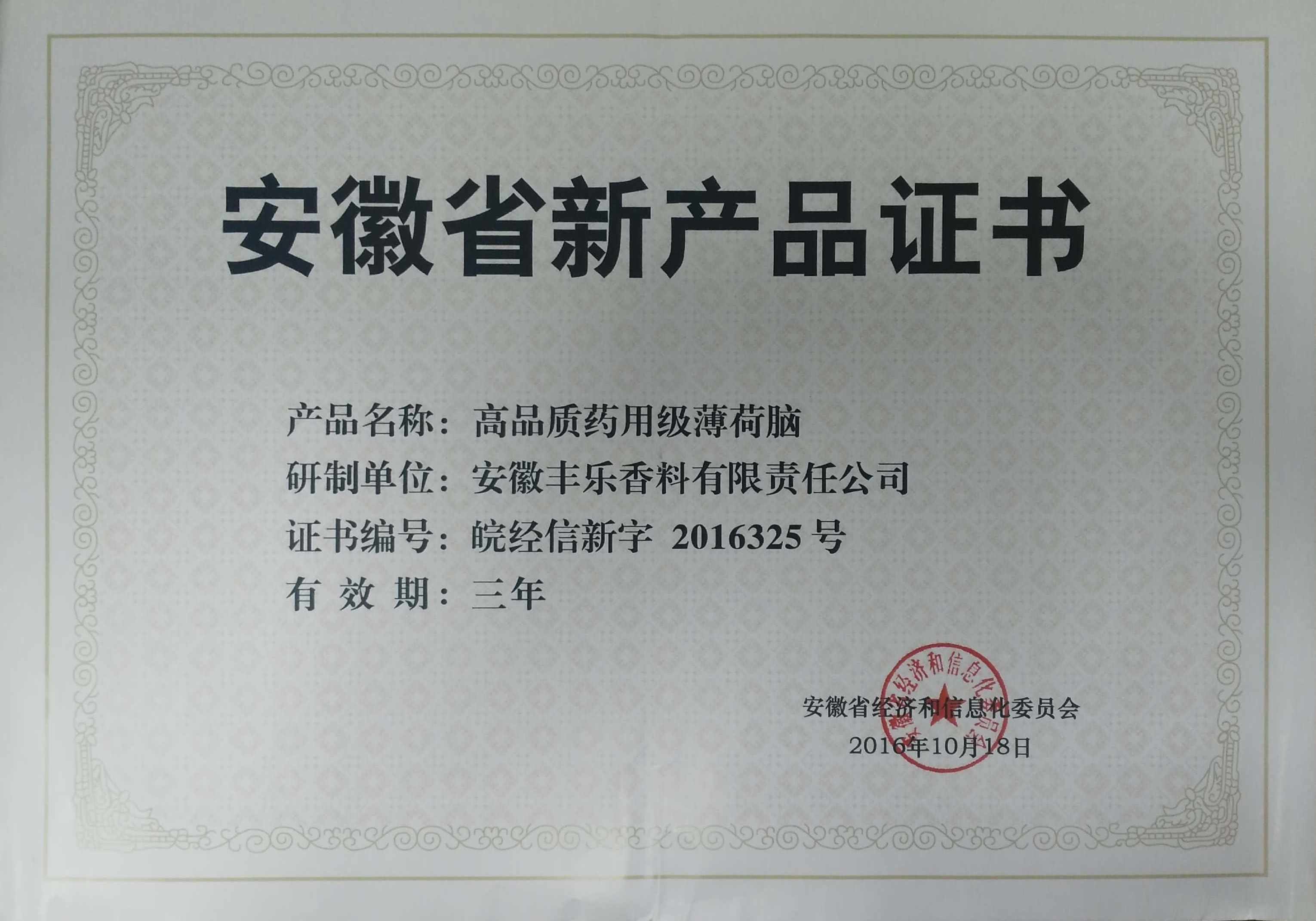 2016年-安徽名牌產(chǎn)品(豐樂(lè)牌天然薄荷腦)
